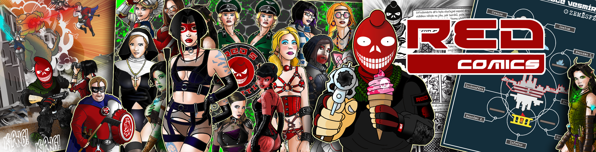 RED je fiktivní komiksová postava žijící v "divnosvětě", který je podobný tomu našemu se vším dobrým i zlým, co k němu patří. Historie REDa je dlouhá a složitá, a jelikož se říká "za vším hledej ženu", musíme ji hledat i zde. Původním komiksovým charakterem totiž byla Abbey, nynější REDova parťačka. Ta vznikla ve spolupráci s mou tehdejší přítelkyní, která ji měla vdechnout svůj žensky cynický pohled na svět. Leč, lásku odnesl čas a milá Abbey putovala do šuplete. Na nápad s Abbey jsem však nezapomněl, jenže na ženský nadhled jsem se už nechtěl spoléhat a tak vznikl mužský ekvivalent, který dostal jméno RED. Neptejte se proč, snad kvůli jeho rudé masce...a ty vlastně také vznikla jaksi "náhodou". Při tvorbě postavy jsem ještě neměl jasno o jeho vzhledu, a tak jsem místo hlavy namaloval jen jakousi dýni v červené kukle a ono to nebylo zase tak špatné.